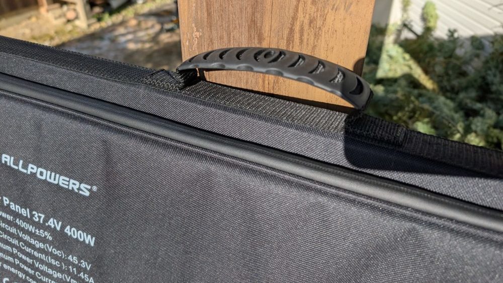続いてはソーラーパネルAP400も見てみましょう。 こちらは裏面がファブリック(布地)仕上げになっており、キャンプギアのような質感です。